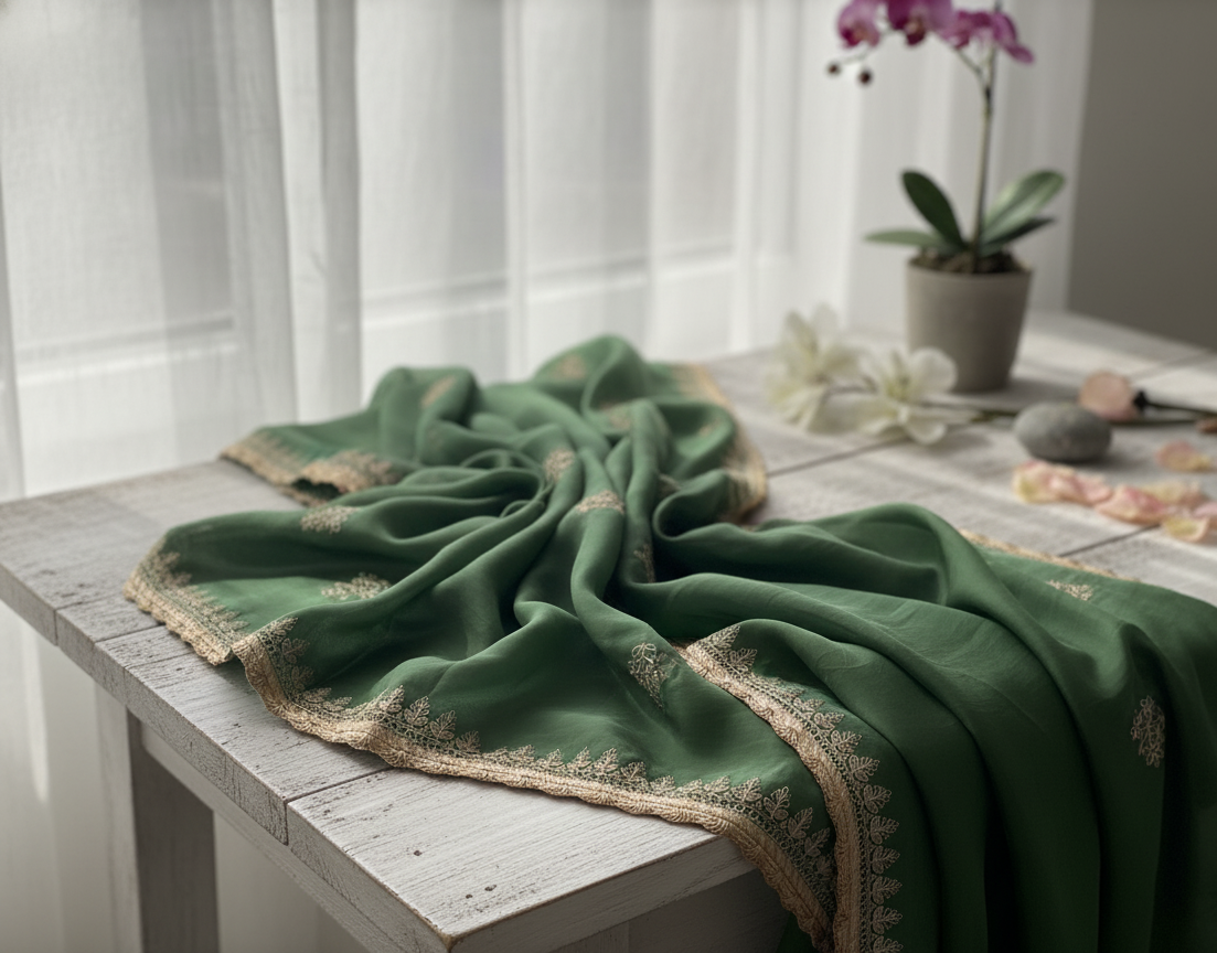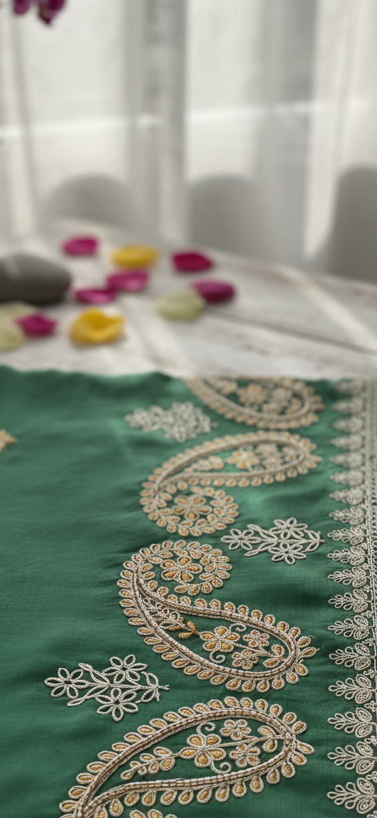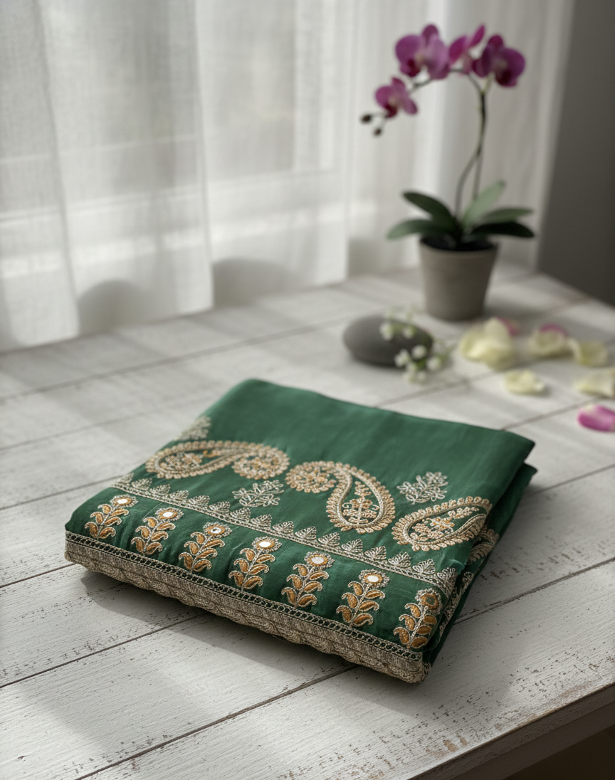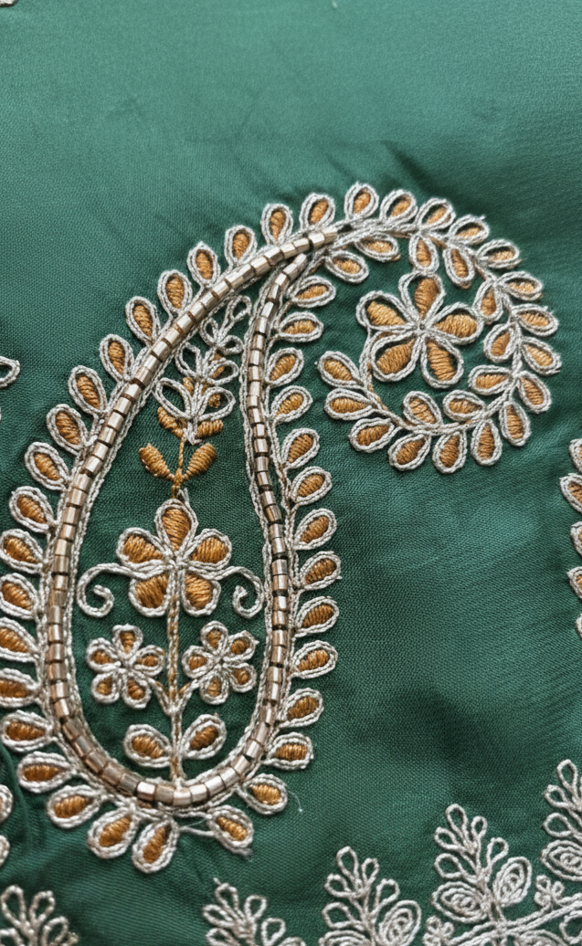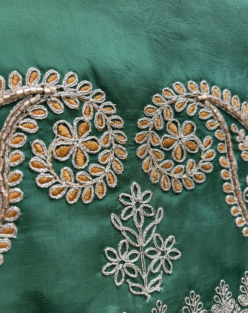 • Lustrous Kasti Moti: Sparkling bead and pearl work is meticulously applied, providing a subtle radiance that beautifully contrasts the rich green fabric.