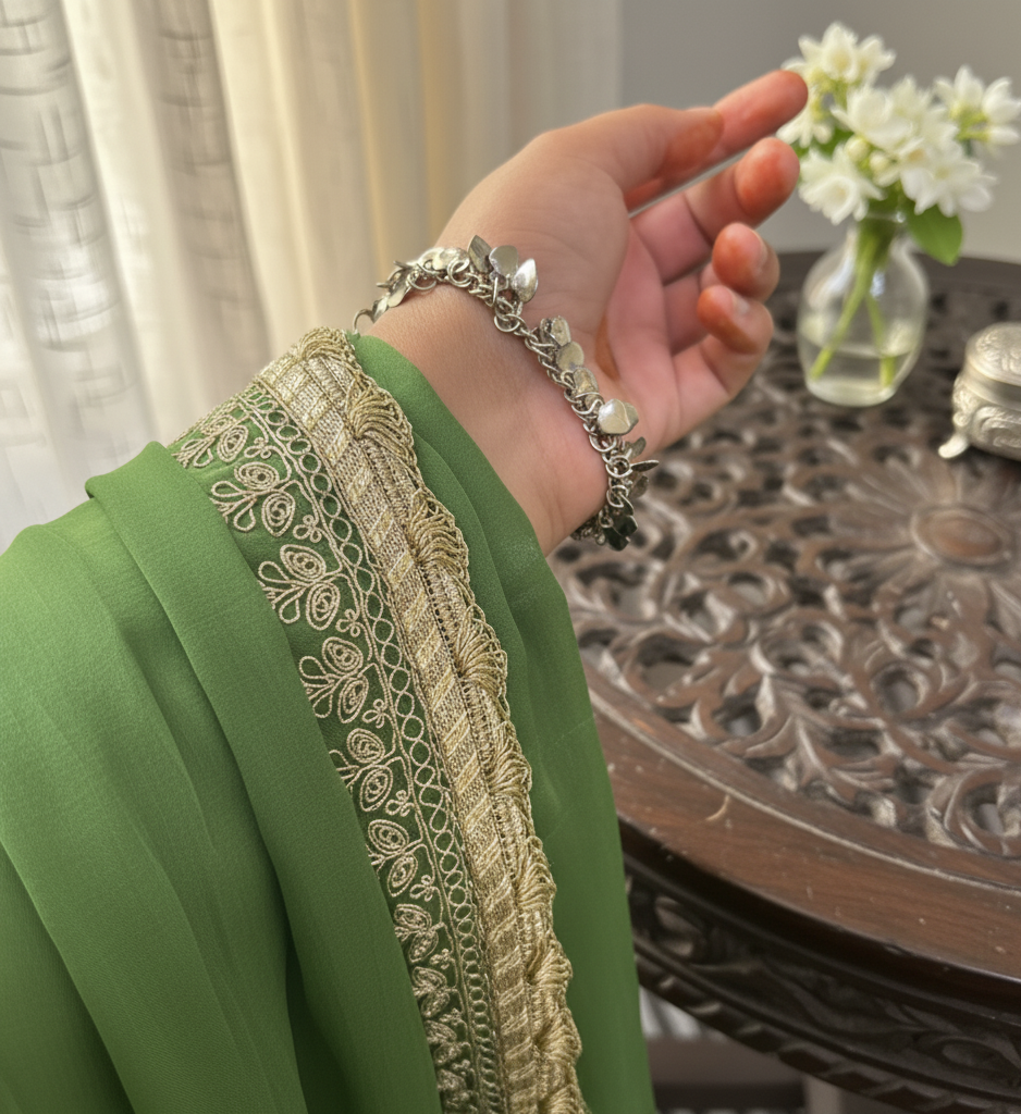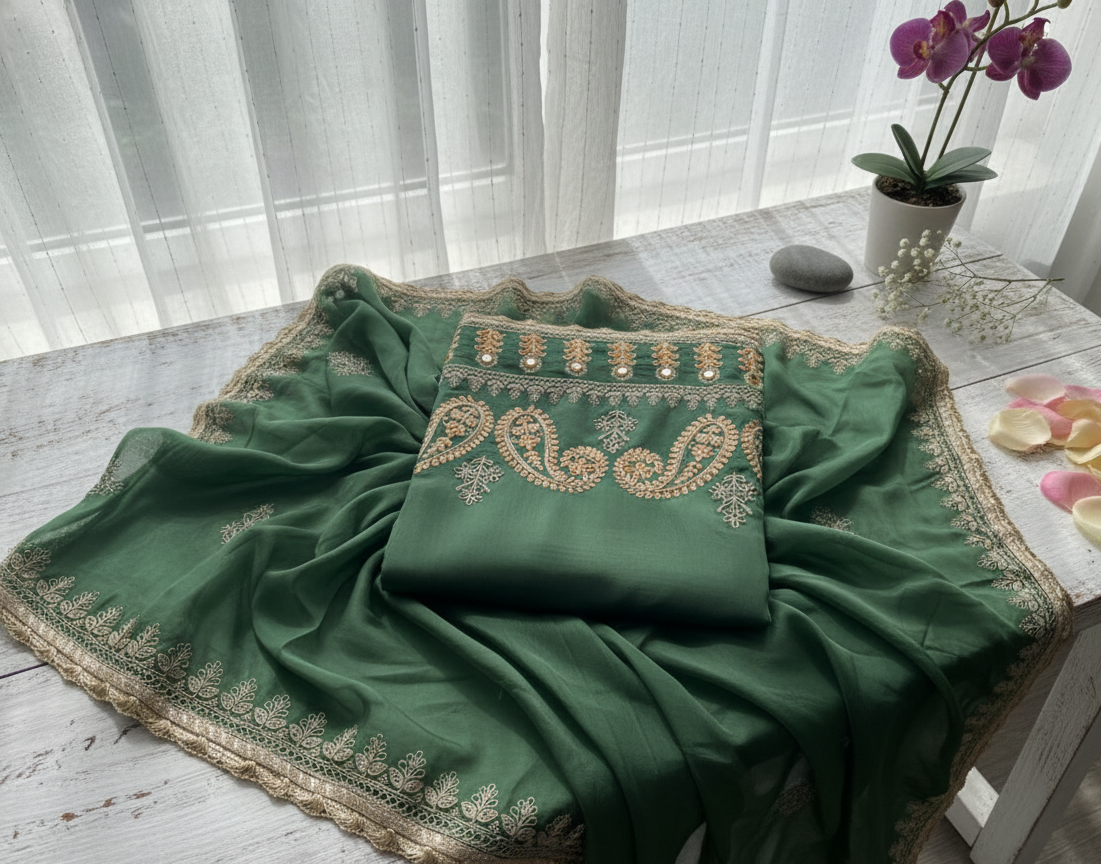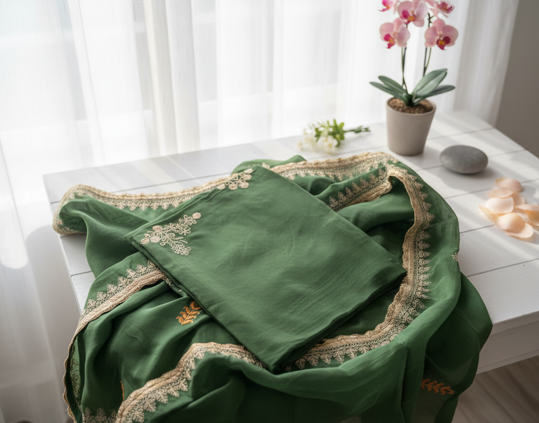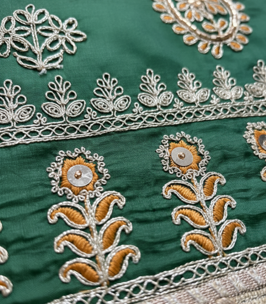 • Suit Fabric: 2.5 meters of luminous Olive Mehandi Green Glass Organza, richly detailed with Dori and Moti work.